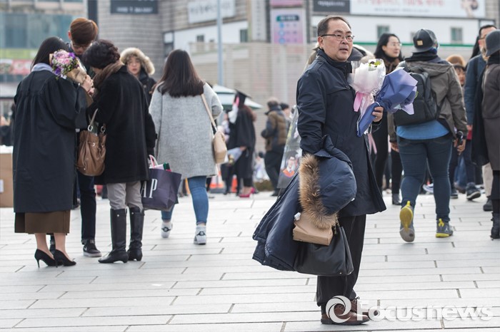 (서울=포커스뉴스) 29일 오후 서울 서대문구 이화여자대학교에서 열린 2015학년도 전기 학위수여식에 참석한 학부형이 졸업생인 딸의 짐을 들고 기다리고 있다.