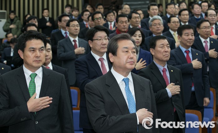 (서울=포커스뉴스) 김무성 새누리당 대표, 김태호 최고위원 등 의원들이 29일 오후 서울 여의도 국회에서 열린 의원총회에 참석해 국기에 대한 경례를 하고 있다.