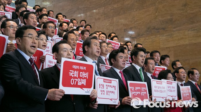 (서울=포커스뉴스) 김무성 새누리당 대표, 원유철 원내대표 등 의원들이 29일 오후 서울 여의도 국회에서 열린 의원총회를 마친 뒤 야당의 필리버스터(무제한 토론) 및 입법마비 규탄 결의대회를 하고 있다.
