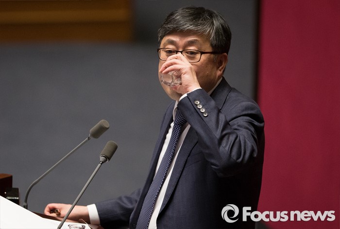 (서울=포커스뉴스) 테러방지법 직권상정에 반발해 야당이 무제한 토론(필리버스터)를 일주일째 진행하며 총 135시간을 돌파한 29일 오후 서울 여의도 국회 본회의장에서 토론에 참여한 최원식 국민의당 의원이 목을 축이고 있다.