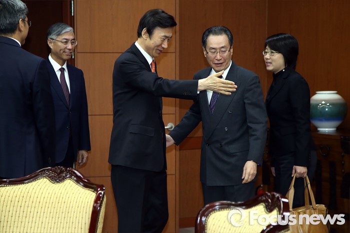 (서울=포커스뉴스) 29일 오후 서울 종로구 세종로 외교부청사에서 윤병세 외교부 장관이 우다웨이 북핵6자회담 중국 측 수석대표에게 자리를 안내하고 있다.