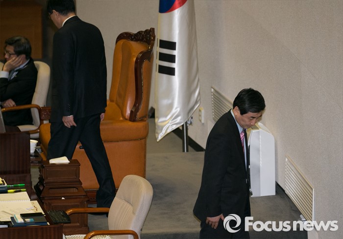 (서울=포커스뉴스) 테러방지법 직권상정에 반발해 야당이 무제한 토론(필리버스터)를 일주일째 진행하며 약 140시간을 돌파한 29일 오후 서울 여의도 국회 본회의장에서 정의화(왼쪽) 국회의장과 이종걸 더불어민주당 원내대표가 만나 대화한 뒤 각각 자리로 향하고 있다.