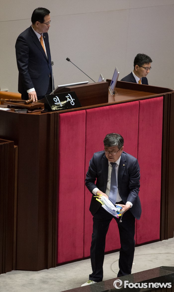 (서울=포커스뉴스) 테러방지법 직권상정에 반발해 야당이 무제한 토론(필리버스터)를 일주일째 진행하며 총 140시간을 돌파한 29일 오후, 서울 여의도 국회 본회의장에서 토론에 참여한 최원식 국민의당 의원이 발언을 마친 후 다리를 절며 퇴장하고 있다.