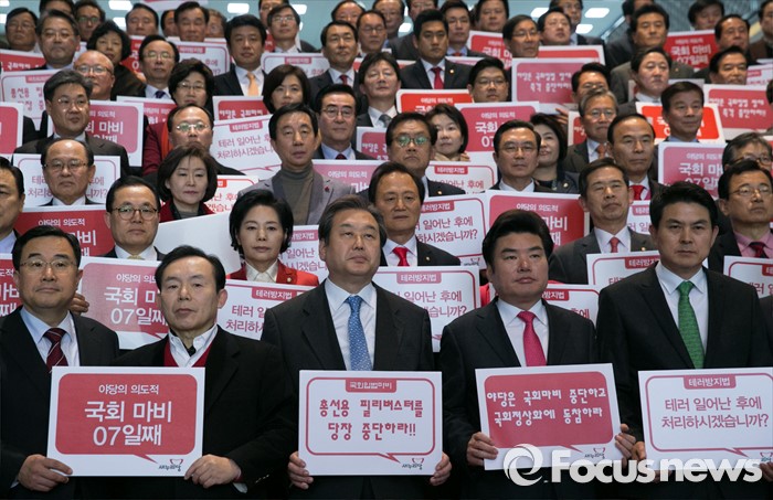 새누리당 소속 의원들은 29일 오후 국회에서 긴급 의원총회를 마친 뒤 본회의장 앞 로텐더홀에서 규탄대회를 열고 △필리버스터 중단 △선거구 획정 등 여야합의 이행 △경제활성화‧노동개혁 법안 처리 등을 촉구했다.