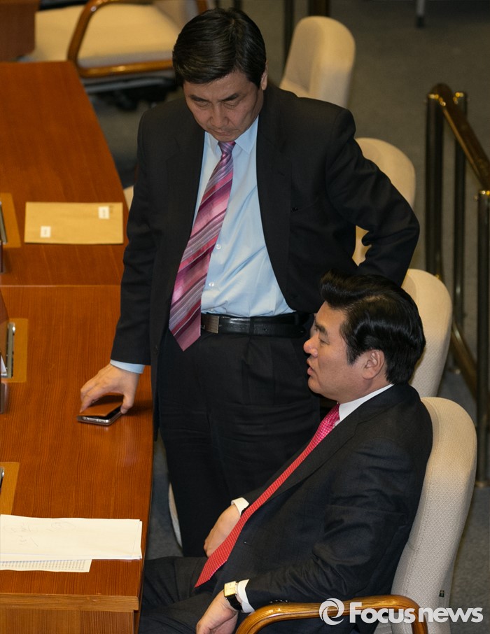 (서울=포커스뉴스) 테러방지법 직권상정에 반발해 야당이 무제한 토론(필리버스터)를 일주일째 진행하며 약 140시간을 돌파한 29일 오후 서울 여의도 국회 본회의장에서 원유철(아래) 새누리당 원내대표와 이종걸 더불어민주당 원내대표가 대화하고 있다.