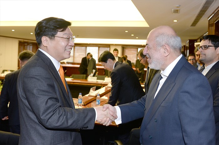 (서울=포커스뉴스) 주형환 산업통상자원부 장관이 29일(현지시간) 이란 에너지부를 방문해 하미드 치트치연(Hamid Chitchian) 이란 에너지부 장관과 면담 앞두고 악수를 하고 있다. <사진제공=산업통상자원부>