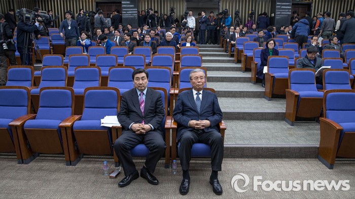 (서울=포커스뉴스) 더불어민주당이 필러버스터 중단을 예고한 1일 오후 이종걸 더민주 원내대표와 김종인 비대위 대표가 서울 여의도 국회에서 열린 의원총회에 참석해 총회 시작을 기다리며 앉아 있다.