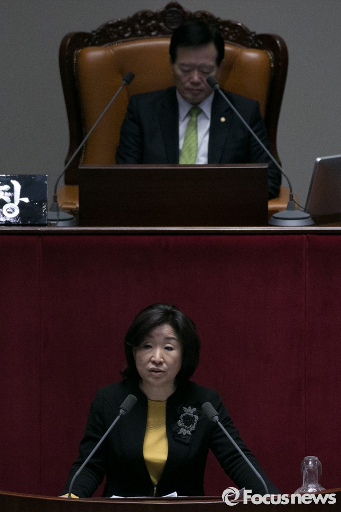 (서울=포커스뉴스) 심상정(앞) 정의당 대표가 2일 오전 서울 여의도 국회 본회의장에서 테러방지법 저지를 위한 무제한 토론(필리버스터)을 하는 동안 정의화 의장이 경청하고 있다.