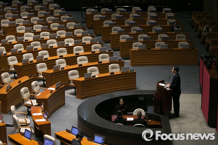 (서울=포커스뉴스) 테러방지법 직권상정에 반발해 야당이 세계 최장 기록의 필리버스터(무제한 토론)를 이어가고 있는 2일 오전 서울 여의도 국회 본회의장에서 토론에 참여한 이종걸 더불어민주당 원내대표가 발언하고 있다. 야당은 이날 필리버스터를 중단하고 선거법 등을 처리할 예정이다.