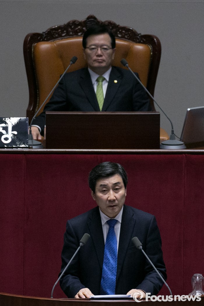 (서울=포커스뉴스) 이종걸(앞) 더불어민주당 원내대표가 2일 오전 서울 여의도 국회 본회의장에서 테러방지법 저지를 위한 무제한 토론(필리버스터)을 하고 있다.