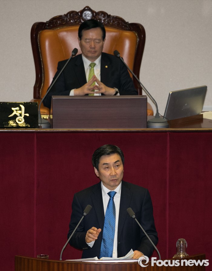 (서울=포커스뉴스) 테러방지법 직권상정에 반발해 야당이 세계 최장 기록의 필리버스터(무제한 토론)를 이어가고 있는 2일 오전 서울 여의도 국회 본회의장에서 토론에 참여한 이종걸 더불어민주당 원내대표가 발언하고 있다. 야당은 이날 필리버스터를 중단하고 선거법 등을 처리할 예정이다.