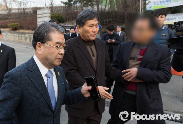 (안산=포커스뉴스) 안산 단원고등학교 개학일인 2일 오전 경기도 안산 단원고등학교에 방문한 이재정(왼쪽) 경기도교육감이 한 신입생 학부모에게 항의 받고 있다.