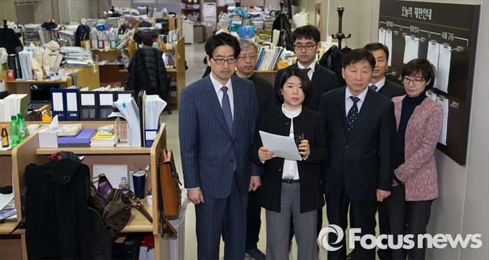 (서울=포커스뉴스) 2일 오전 서울 서초구 중앙지방법원 기자실에서 위은진(앞줄 왼쪽 두번째) 대한변호사협회 인권위원회 부위원장이 테러방지법안 의견서 사태에 관한 입장을 발표하고 있다.