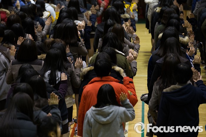 (안산=포커스뉴스) 2일 오전 경기도 안산시 단원구 올림픽기념관에서 열린 단원고등학교 입학식에 참석한 신입생들이 입학선서 하고 있다.
