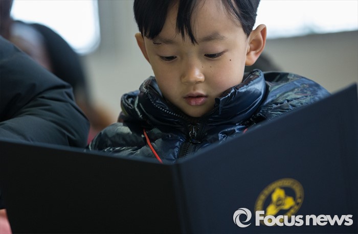 (서울=포커스뉴스) 2일 오전 서울 이태원 초등학교에서 열린 2016학년도 입학식에 참석한 신입생이 입학허가서를 읽고 있다.