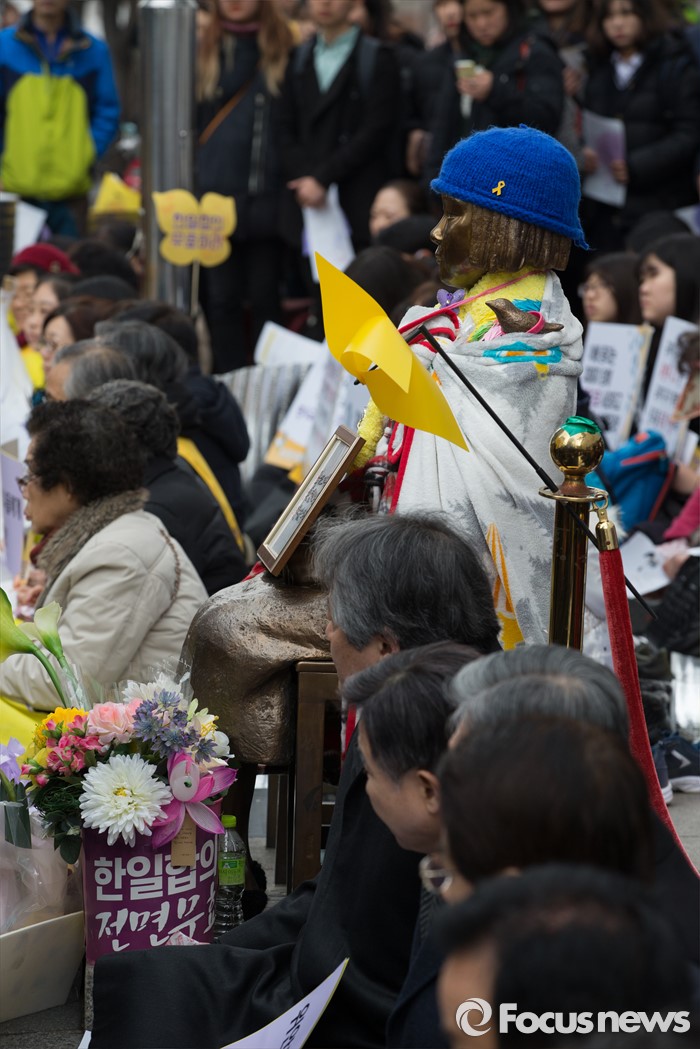 (서울=포커스뉴스) 2일 오후 서울 종로구 옛 주한일본대사관 앞에서 한국정신대문제대책협의회, 학생들을 비롯한 참석자들이 '제1220차 일본군 위안부 문제해결을 위한 정기 수요시위'를 하고 있다.