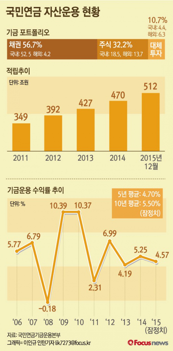 (서울=포커스뉴스) 2일 국민연금기금운용위원회에 따르면 2015년말 현재 국민연금기금 순자산은 512조3241억원으로 2014년말(469조8229억원) 대비 9.0%(42조5012억원) 증가했다.
