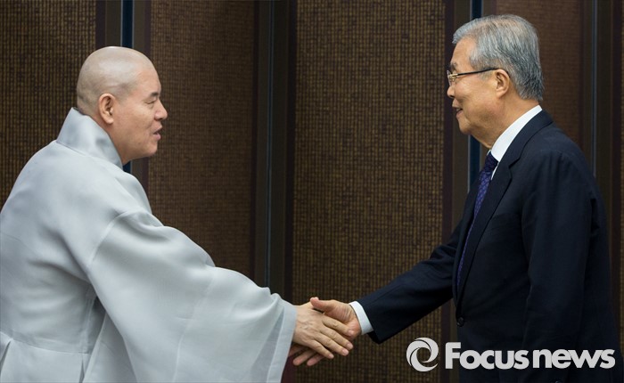 (서울=포커스뉴스) 2일 오후 서울 종로구 조계사를 찾은 김종인(오른쪽) 더불어민주당 비상대책위원회 대표가 조계종 총무원장 자승 스님을 만나 악수하고 있다.