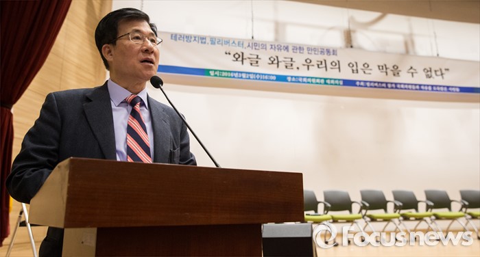 (서울=포커스뉴스) 2일 오후 서울 여의도 국회 의원회관에서 열린 테러방지법, 필리버스터, 시민의 자유에 관한 만민공동회 행사에서 신경민 더불어민주당 의원이 발언을 하고 있다.