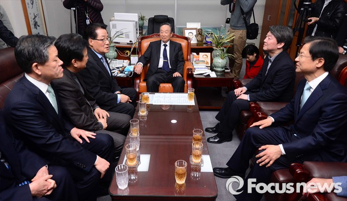 (서울=포커스뉴스) 국민의당 안철수(오른쪽 두번째), 천정배(오른쪽) 공동대표가 2일 오후 서울 여의도 국회 의원회관 박지원(왼쪽 세번째) 의원 집무실을 방문해, 박 의원과 환담하고 있다. 왼쪽부터 주승용 원내대표, 김영환 공동선대위원장, 박 의원, 권노갑 전 더민주 상임고문, 안 공동대표, 천 공동대표.