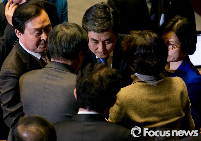 (서울=포커스뉴스) 테러방지법 직권상정에 반발해 야당이 세계 최장 기록의 필리버스터(무제한 토론)를 진행한 2일 오후 서울 여의도 국회 본회의장에서 마지막 주자인 이종걸 더불어민주당 원내대표가 토론을 마친 뒤 동료 의원들의 격려를 받으며 퇴장하고 있다. 마지막 주자로 나선 이 원내대표는 이날 정청래 의원의 기록인 11시간 40분을 경신한 12시간 31분을 기록하며 토론을 마쳤으며, 야당의 필리버스터는 약 193시간만에 종료됐다.