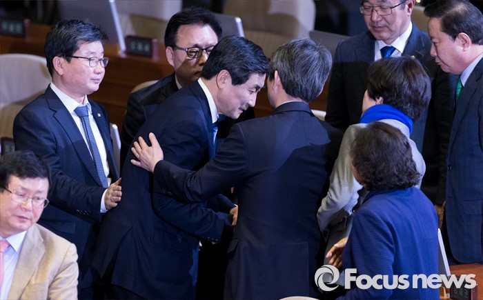 (서울=포커스뉴스) 테러방지법 직권상정에 반발해 야당이 세계 최장 기록의 필리버스터(무제한 토론)를 진행한 2일 오후 서울 여의도 국회 본회의장에서 마지막 주자인 이종걸 더불어민주당 원내대표가 토론을 마친 뒤 동료 의원들의 격려를 받으며 퇴장하고 있다. 마지막 주자로 나선 이 원내대표는 이날 정청래 의원의 기록인 11시간 40분을 경신한 12시간 31분을 기록하며 토론을 마쳤으며, 야당의 필리버스터는 약 193시간만에 종료됐다.