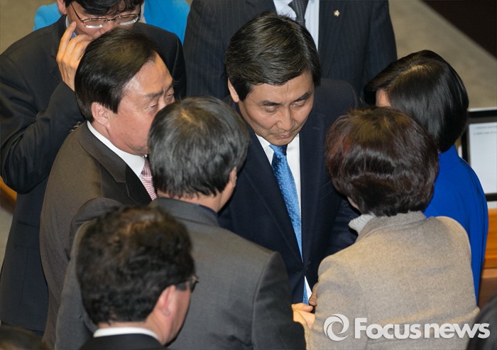 (서울=포커스뉴스) 테러방지법 직권상정에 반발해 야당이 세계 최장 기록의 필리버스터(무제한 토론)를 진행한 2일 오후 서울 여의도 국회 본회의장에서 마지막 주자인 이종걸 더불어민주당 원내대표가 토론을 마친 뒤 동료 의원들의 격려를 받으며 퇴장하고 있다. 마지막 주자로 나선 이 원내대표는 이날 정청래 의원의 기록인 11시간 40분을 경신한 12시간 31분을 기록하며 토론을 마쳤으며, 야당의 필리버스터는 약 193시간만에 종료됐다.