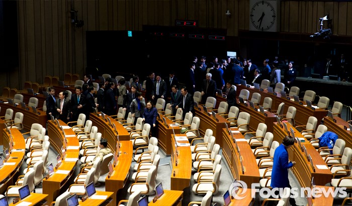 (서울=포커스뉴스) 테러방지법 직권상정에 반발해 야당이 세계 최장 기록의 필리버스터(무제한 토론)를 진행한 2일 오후 서울 여의도 국회 본회의장에서 마지막 주자인 이종걸 더불어민주당 원내대표가 토론을 마친 뒤 동료 의원들의 격려를 받으며 퇴장하고 있다. 마지막 주자로 나선 이 원내대표는 이날 정청래 의원의 기록인 11시간 40분을 경신한 12시간 31분을 기록하며 토론을 마쳤으며, 야당의 필리버스터는 약 193시간만에 종료됐다.