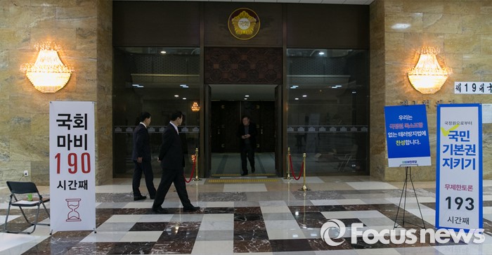(서울=포커스뉴스) 테러방지법 직권상정에 반발해 진행됐던 야당의 필리버스터(무제한 토론)이 종료된 2일 오후 서울 여의도 국회 본회의장 앞에 새누리당(왼쪽)과 더불어민주당의 의견이 담긴 배너가 각각 세워져 있다.