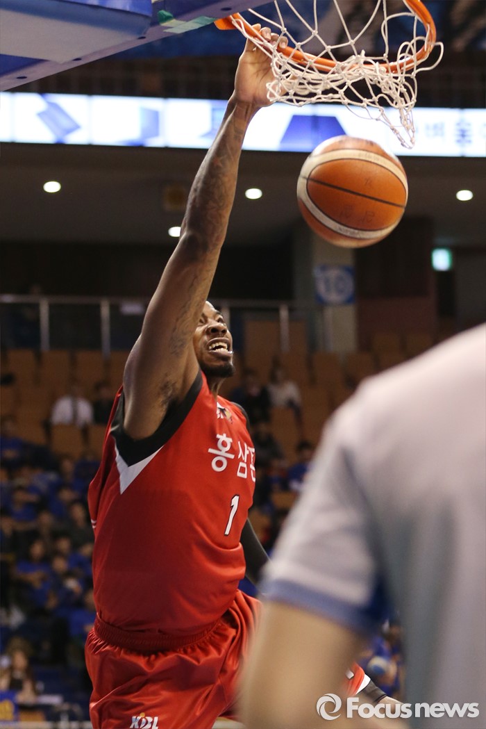 (서울=포커스뉴스) 2일 서울 잠실실내체육관에서 열린 2015-2016 프로농구 삼성-KGC 6강플레이오프 4차전에서 KGC 찰스 로드가 삼성 라틀리프를 제치고 원핸드 덩크를 림안에 꽂아 넣고 있다.