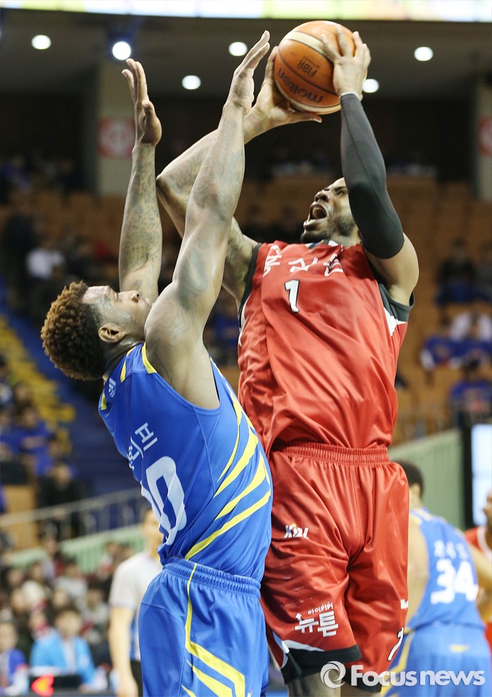 (서울=포커스뉴스) 2일 서울 잠실실내체육관에서 열린 2015-2016 프로농구 삼성-KGC 6강플레이오프 4차전에서 KGC 찰스 로드가 삼성 라틀리프의 마크 위로 점프슛을 쏘고 있다.