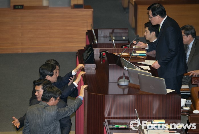 (서울=포커스뉴스) 2일 오후 서울 여의도 국회에서 열린 340회 국회(임시회) 7차 본회의에 참석한 이종걸 더불어민주당 원내대표, 이춘석 원내수석부대표가 정의화 국회의장의 모두발언에 항의하자 원유철 새누리당 원내대표, 조원진 원내수석부대표가 말리고 있다.