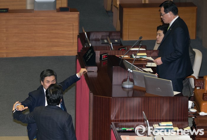 (서울=포커스뉴스) 2일 오후 서울 여의도 국회에서 열린 340회 국회(임시회) 7차 본회의에 참석한 이종걸 더불어민주당 원내대표가 정의화 국회의장의 모두발언에 항의하자 원유철 새누리당 원내대표가 말리고 있다.