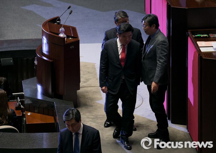(서울=포커스뉴스) 2일 오후 서울 여의도 국회에서 열린 340회 국회(임시회) 7차 본회의에 참석한 이종걸 더불어민주당 원내대표, 이춘석 원내수석부대표가 정의화 국회의장의 모두발언에 항의하자 원유철 새누리당 원내대표, 조원진 원내수석부대표가 말리며 대화한 뒤 각각 자리로 향하고 있다.