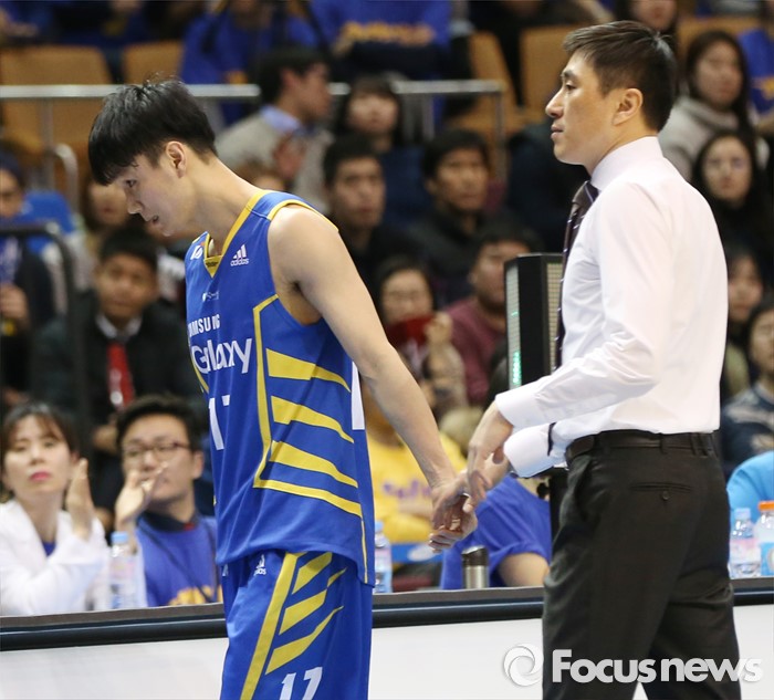 (서울=포커스뉴스) 2일 서울 잠실실내체육관에서 열린 2015-2016 프로농구 삼성-KGC 6강플레이오프 4차전에서 삼성 이상민 감독이 5파울로 퇴장당하는 이시준을 위로하고 있다.