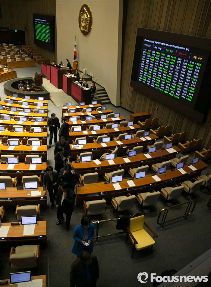 (서울=포커스뉴스) 2일 오후 서울 여의도 국회에서 열린 340회 국회(임시회) 7차 본회의에서 국민보호와 공공안전을 위한 테러방지법안에 대한 수정안(주호영 의원 외 156인 발의)의 표결이 시작되자 야당 의원들이 퇴장하고 있다. 이날 테러방지법은 야당이 표결에 참여하지 않은 재석 157인 중 찬성 156인, 반대 1인으로 통과됐다.