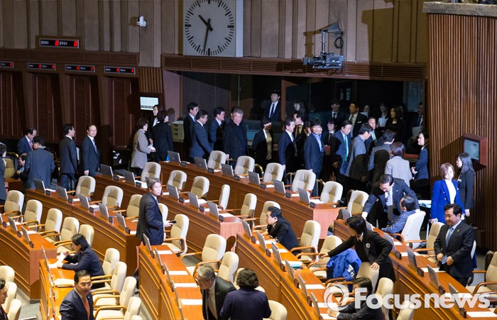 (서울=포커스뉴스) 2일 오후 서울 여의도 국회에서 열린 340회 국회(임시회) 7차 본회의에서 국민보호와 공공안전을 위한 테러방지법안에 대한 수정안(주호영 의원 외 156인 발의)이 표걸되자 야당 의원들이 퇴장하고 있다. 테러방지법안은 재석 157인 중 찬성 156인, 반대 1인으로 통과됐다.