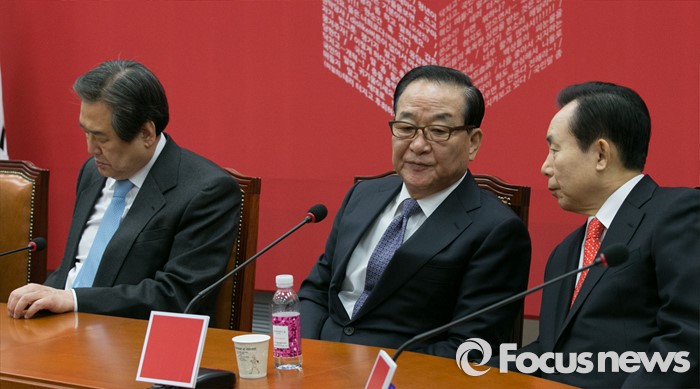 (서울=포커스뉴스) 서청원(가운데) 새누리당 최고위원과 이인제(오른쪽) 최고위원이 3일 오전 서울 여의도 국회에서 열린 최고위원회의에 참석해 대화하는 동안, 김무성 대표가 생각에 잠겨 있다.