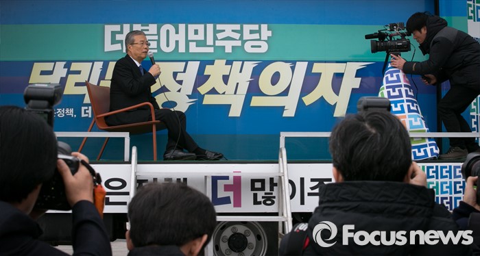 (서울=포커스뉴스) 김종인 더불어민주당 비대위 대표가 3일 오전 서울 여의도 국회 앞에서 열린 달리는 정책의자 발대식에 참석해 홍보영상을 촬영하고 있다.