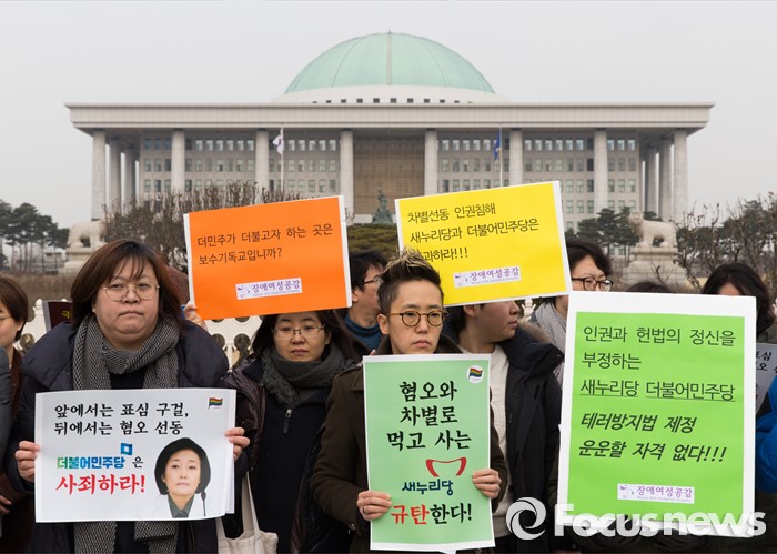 (서울=포커스뉴스) 3일 오전 서울 여의도 국회 앞에서 성소수자차별반대 무지개행동을 비롯한 인권시민사회단체가 성소수자 혐오, 차별에 동조하는 새누리당 김무성 대표와 더불어민주당 박영선 비대위원을 규탄하는 기자회견을 하고 있다.