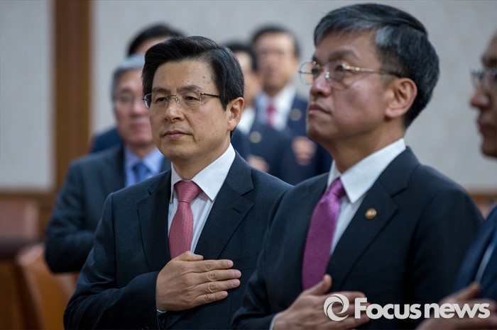 (서울=포커스뉴스) 황교안 국무총리가 3일 오전 서울 종로구 정부서울청사에서 열린 '국무회의'에 자리해 국민의례를 하고 있다.