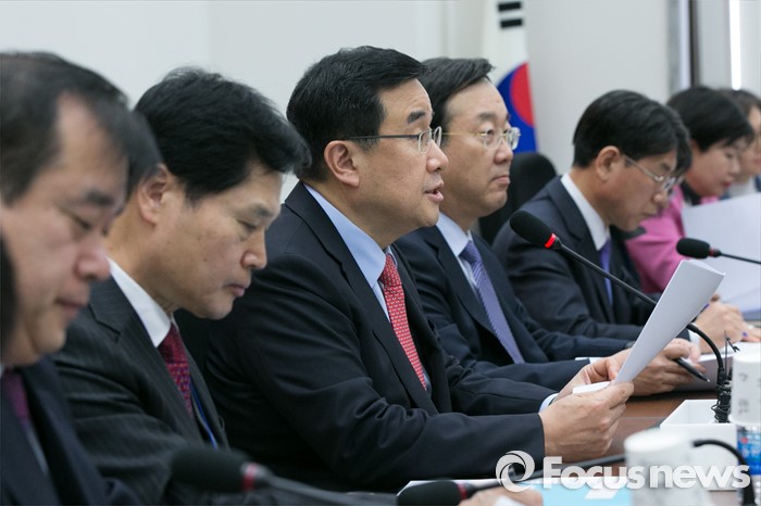 (서울=포커스뉴스) 김정훈(왼쪽 세번째) 새누리당 정책위의장이 3일 오전 서울 여의도 국회에서 총선공약 배려나누기 기자간담회에 참석해 인사말을 하고 있다.