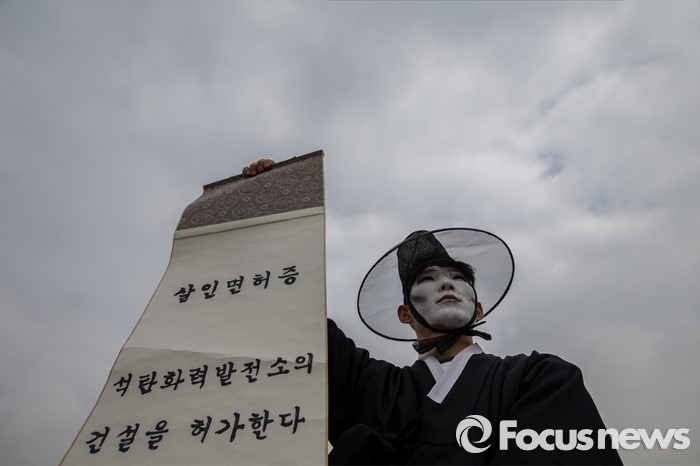 (서울=포커스뉴스) 3일 오전 서울 종로구 광화문 광장에서 그린피스 회원들이 충남지역 신규 석탄화력발전소 허가 취소를 촉구하는 퍼포먼스를 펼치고 있다.