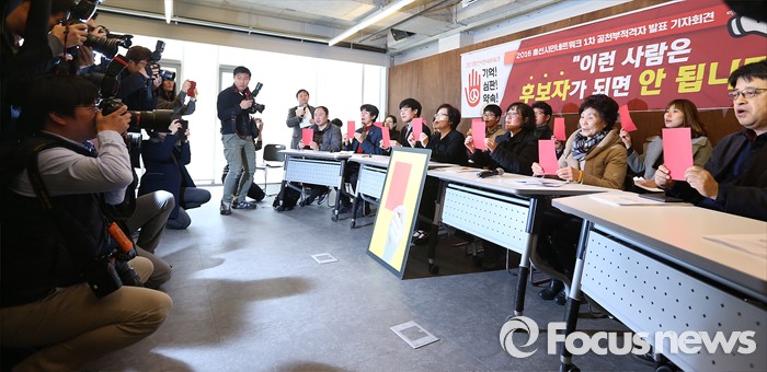 (서울=포커스뉴스) 3일 오전 서울 참여연대 아름드리홀에서 열린 '2016 총선시민네트워크 1차 공천부적격자 발표 기자회견'에 참석한 운영위원들이 관련 구호를 외치고 있다.