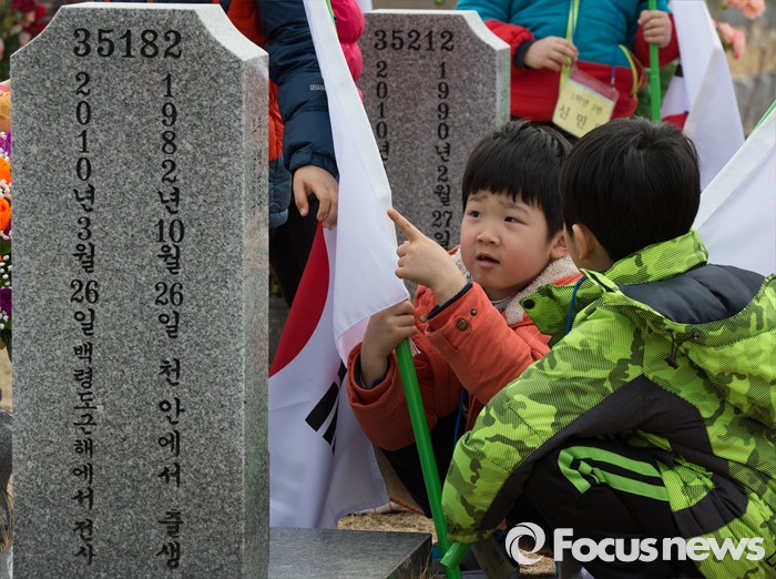 (대전=포커스뉴스) 3일 오전 입학 후 첫 수업에 들어간 대전 화정초등학교 1학년 신입생들이 대전 유성구 국립대전현충원 천안함 46용사 묘역을 찾아 참배하고 있다.