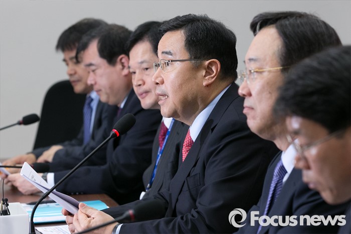 김정훈 정책위의장은 "일자리 중심 성장의 시동을 걸고 차별과 격차 해소 등 공정사회의 닻을 올리겠다"며 "국민 맞춤형 공약·실현 가능한 공약 개발에 정책역량 집중할 것"이라고 강조했다.김정훈(오른쪽 세번째) 새누리당 정책위의장이 3일 오전 서울 여의도 국회에서 총선공약 배려나누기 기자간담회에 참석해 인사말을 하고 있다. 2016.03.03 박철중 기자