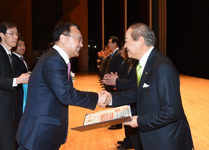 (서울=포커스뉴스) 유일호 부총리 겸 기획재정부 장관이 3일 서울 강남구 코엑스에서 열린 '제50회 납세자의 날'행사 에 참석, 전순표 세스코 대표이사에게 모범납세자 금탑산업훈장을 수여하고 있다. <사진제공=기획재정부>