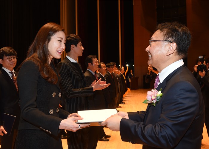 [부자동네타임즈 이채봉 기자] 유일호 부총리 겸 기획재정부 장관이 3일 서울 강남구 코엑스에서 열린 '제50회 납세자의 날'행사 에 참석, 배우 최지우에게 모범납세자 대통령표창을 수여하고 있다. <사진제공=기획재정부>