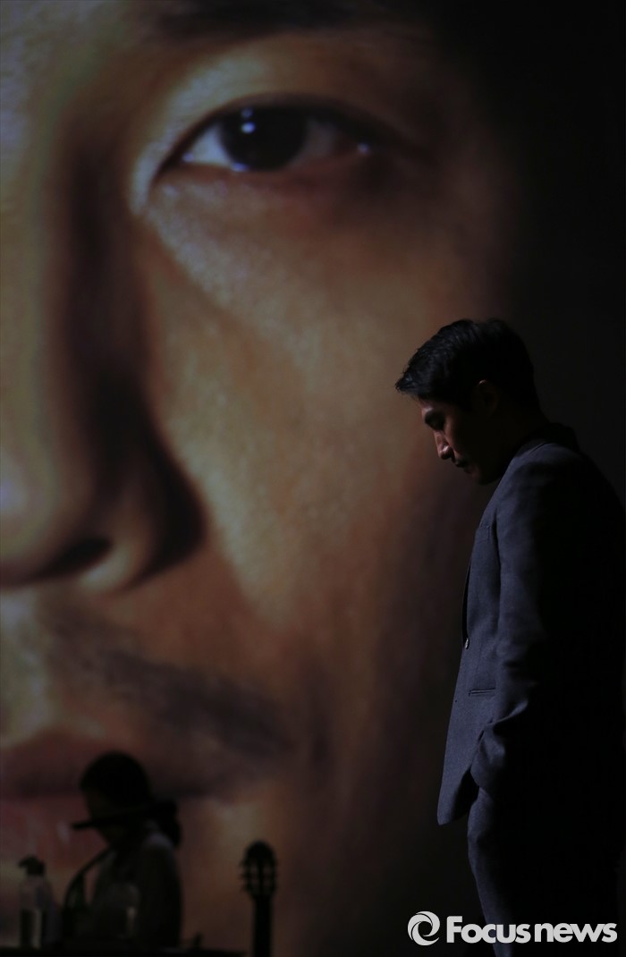 (서울=포커스뉴스) 3일 오후 서울 중구 명동예술극장에서 열린 연극 '빛의 제국' 프레스콜 행사에 참석한 배우 지현준이 주요장면을 시연하고 있다.