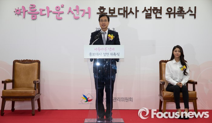 (과천=포커스뉴스) 3일 오후 경기도 과천시 중앙선거관리위원회에서 열린 '아름다운 선거 홍보대사 위촉식'에서 김용희 사무총장이 축사를 하고 있다.